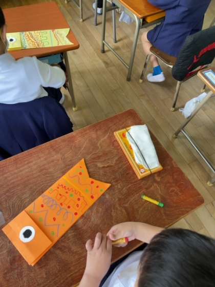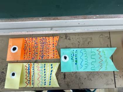 一枚の色画用紙から鯉のぼりを作っていきました。真っ直ぐの線や波線、ギザギザの線、くねくねな線、ぐるぐる丸く描いてうろこや模様をつけていました。