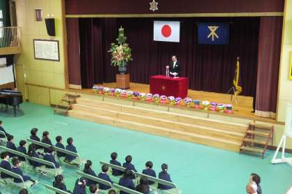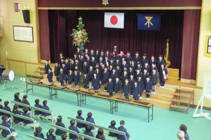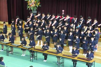 PTA会長の祝辞が終わり、新2年生の「お祝いの催し」が始まると緊張がほぐれ、楽しそうに見ていました。一方、新2年生は緊張しながらも、大きな声で校歌を紹介し、ことばも合奏も頑張っていました。
