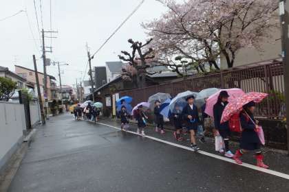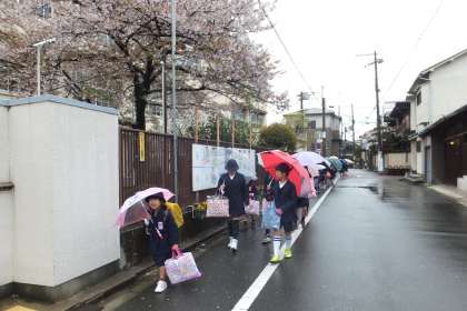 あいにくの雨で、傘をさしての登校になりました。1年生は初めての集団登校、元気に「おはようございます!!」と、挨拶してくれていました!!
