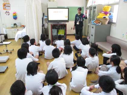 最初に、保健室の先生から身体の成長や計測の仕方の話を聞き、身長・体重・座高の3計測をしました。