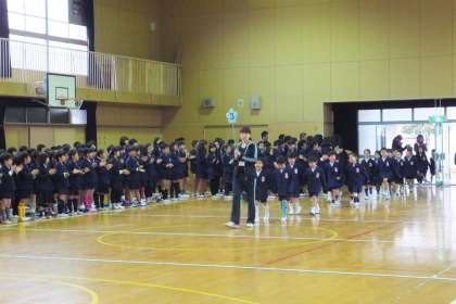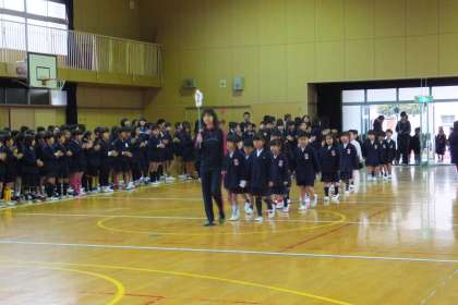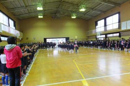 体育館で在校生が拍手で迎える中、少し緊張した様子で1組から順番に入場してきました。