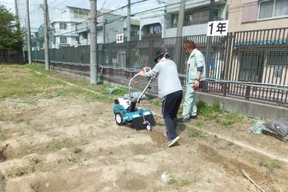 今までは、担当の先生と管理作業員が4月中旬から5月のG・W明けぐらいまでの間、毎日放課後に作業を行っていましたが、昨年の校長戦略予算で購入した耕耘機を使って行うと、約1時間で終了することができました。「これは便利だ、助かるわ!」と思わず声が上がりました。
