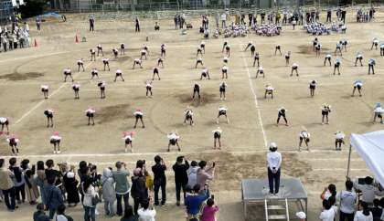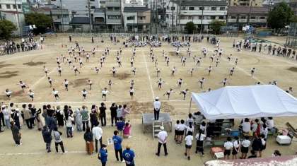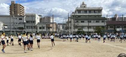 『はたらく細胞!!』のアニメソングに合わせて、ペットボトルを叩きながら踊り、運動場に大きな元気な音が響き渡りました。元気いっぱいの2年生のみんなに合ったダンスで、楽しく元気に踊ることができました。