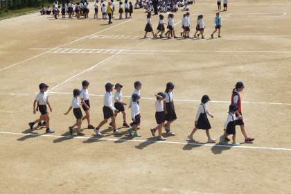 夏のような陽ざしの東運動場に登校班別に集合し、最初に班長さんがお手本にコースを確認しながら歩きました。