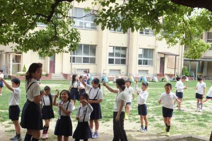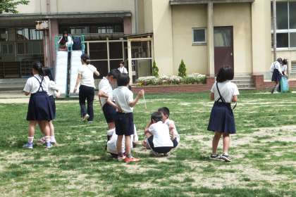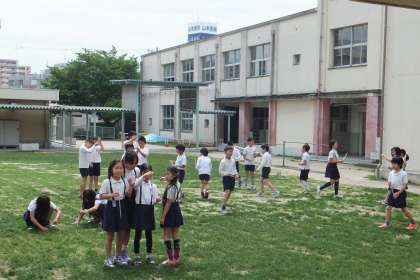 4年生の理科の学習の様子です。天気と一日の気温の単元で、一人ひとり温度計を持って、中運動場に出てきました。日向や日陰での気温の違いを確認していました。