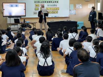 犯罪防止(万引き)についてのペープサート劇や、被害防止(声かけ被害)について、いじめ防止、スマホの安全利用、SNSを通じた犯罪被害防止など様々な観点から、非行の重大さに対する理解や犯罪に巻き込まれないための行動など子どもたちに直接話してくださいました。どの学年も、指導員さんからの問いかけなどに、しっかりと答えをしながら、真剣に学習に取り組んでいました。
