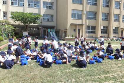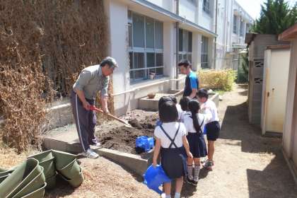 5月11日(月)、2年生の生活科の時間の様子です。今日は、学年でミニトマトの苗の植え付けをしました。