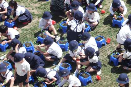 一人ひとりのプランターに土を入れてもらい、先生から苗が配られました。肥料を入れ、「早く大きくならないかな??」と願いを込めながら、丁寧に苗を植えていきました。