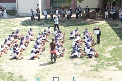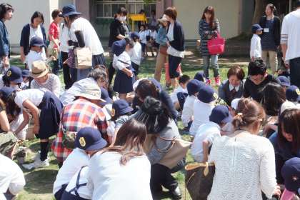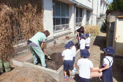 子どもたちは、保護者の皆さんと一緒にプランターに土を入れ、ペチュニアやポーチュラカなどの花を植えていきます。今日は、台風一過の青空で陽ざしも強いので、汗をかきながらがんばりました。