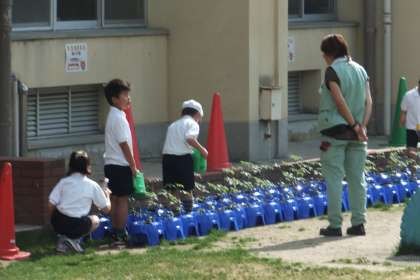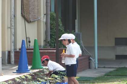 朝、登校し教室に上がると、一目算に、ペットボトルを持ち中運動場に下りてきます。みんなで楽しそうに話しながら、水やりをしていました。