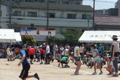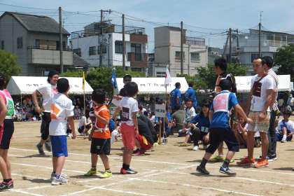 最初の競技、「スプーンリレー」には子どもたちもたくさん参加し、とても楽しそうでした。しかし、町会対抗リレー予選になると、子どもたちの目も真剣!!一生懸命、バトンを繋いでいました!!