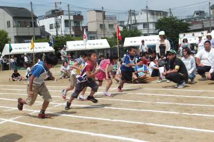 障害物走に徒競走、子どもたちの額からは、玉のような汗が流れています。さらに、綱引きでは、Tシャツをビッショリさせながら頑張っていました!!