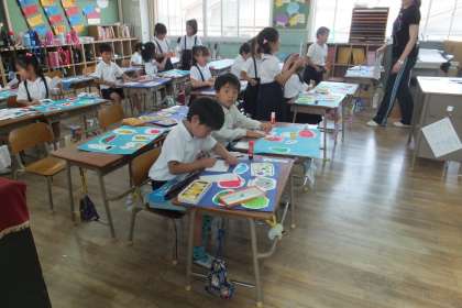 クレヨンで自分の好きなものを描き、色画用紙に貼っていきました。