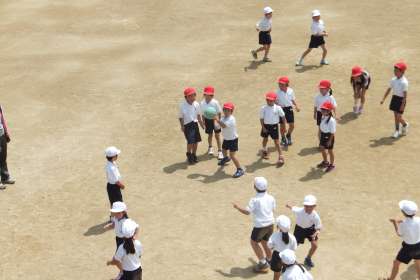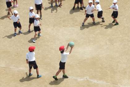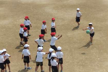 それと直接関係ないかもしれませんが、東運動場で1年生がドッジボールをしていました。横から投げたり、前から突き出すように投げたりするので、投げ方を先生に教えてもらいながら、ゲームをしていました。子どもたちは、小さなコートを走り回って、とても楽しそうでした!!