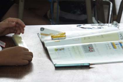 たし算をブロックを使って学習していました。教員がモニターに教科書を拡大投影機で拡大して映し、大きな絵を使って説明します。たとえば、女の子が棒を3本、男の子が1本持っている絵であれば、その本数にブロック個数を合わせ、黒板で女の子の本数のブロックと男の子の本数のブロックを合わせていくらになるかを学習します。