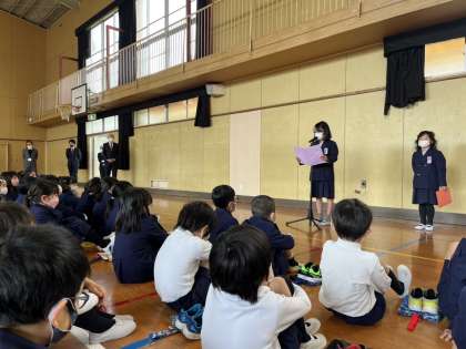 5年生の代表児童に修了証を渡し、1年生、4年生の代表児童が1年間の思い出を発表しました。最後に春休みの過ごし方のお話で修了式を終えました。