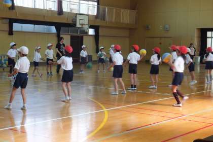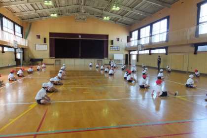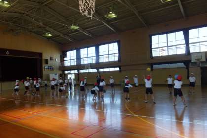 まず、柔軟運動で身体をほぐしました。そのあと、体育館の両側に分かれ、ドッジボールをいろんな投げ方で投げ、キャッチする練習をしていました。