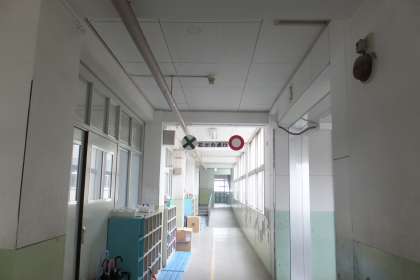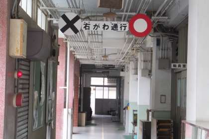 さて、雨が降ると廊下が滑り、走ったりすると大きな事故につながります。そこで、廊下を入らず右側通行を徹底しようと、管理作業員さんが廊下に標識を作ってくれました。