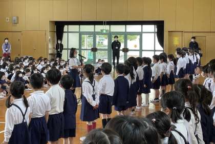2年生から6年生のお兄さん、お姉さんたちの拍手や音楽に合わせての手拍子で、1年生のみんなが元気に入場しご対面しました。ちょっと緊張気味の1年生でしたが、校長先生のお話や校歌や、児童代表の歓迎の言葉もしっかりと聞くことができました。