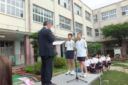 校長先生のお話の後、子ども会のソフトボールチーム「ファイターズ」の表彰がありました。