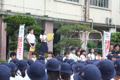 続いて、児童会から、「オリエンテーリング2015のスローガン」「右側通行の徹底」「あいさつ運動」の呼びかけがありました。