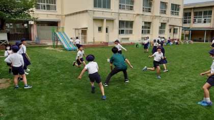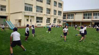 中運動場でクラス遊びの時間です。遊び係を中心にみんなでルールを確認し、あとは思い切り体を動かして遊んでいました。