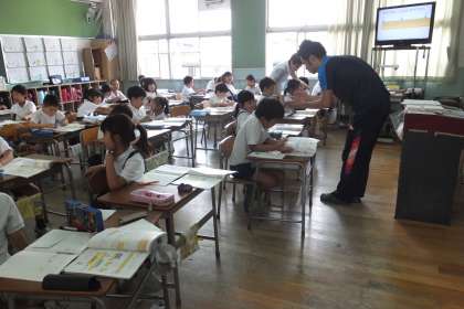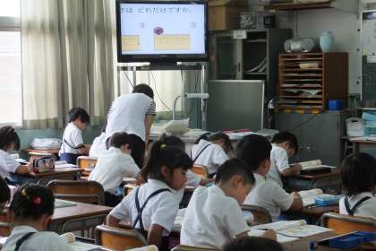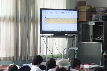 最初に先生から、実物投影機で拡大した竹ものさしで使い方を教わり、自分の持ち物の長さを測ります。