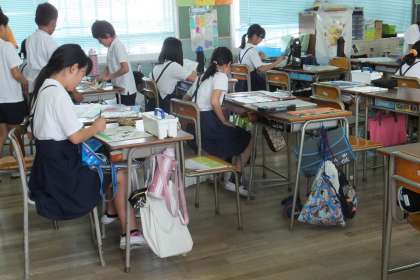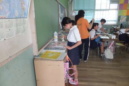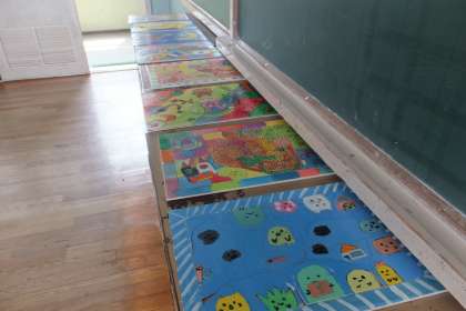 木製パズルの制作をしていました。子どもたちは、思い思いのデザインをパズルの上に絵の具を使って描き、仕上げにニスを塗り、乾かせば出来上がりです。