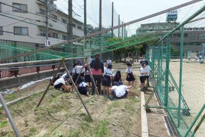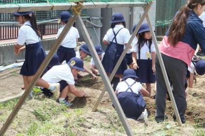 6月11日(木)、昨日の「梅雨の晴れ間」に1年生が学習園の雑草抜きをしていました。 1年生は、学習園にひまわりをうえています。