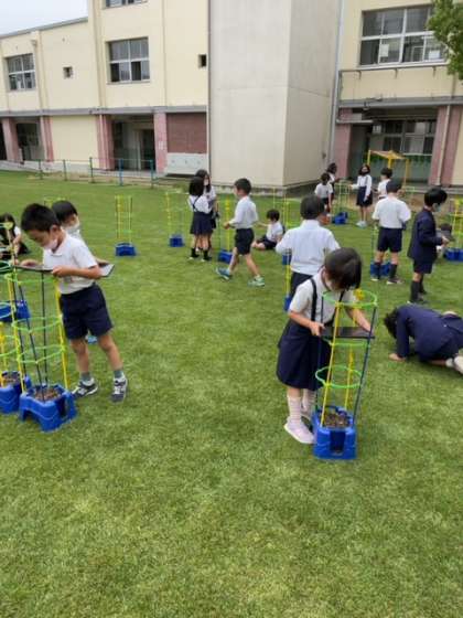 その後2年生は、タブレットで苗の写真を撮って、観察日記をつけていました。