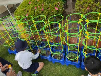 1年生は朝顔やプランターの花に、2年生はミニトマトの苗に水をたっぷりとあげていました。
