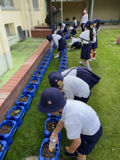 児童朝会が終わると、1・2年生は中運動場に残り、水やりを頑張っていました。
