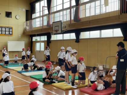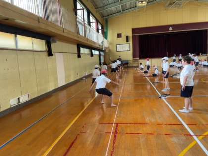 体育館では、反復横跳びや上体起こしを5年生が行っていました。