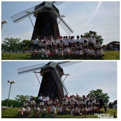 鶴見緑地公園に到着し、まずは風車の前で記念撮影をし。バラ園では、さまざまのな種類のバラが満開の季節を迎えていました。