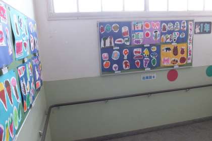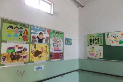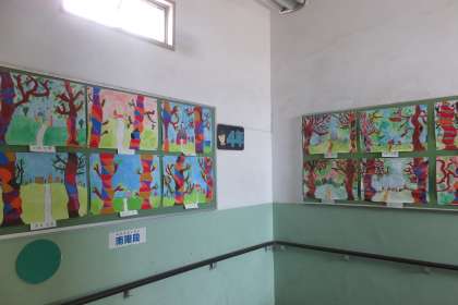 子どもたちが、図工の時間や習字の時間に制作した作品を掲示しています。各学級の教室にも様々な作品が掲示しています。