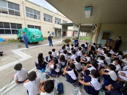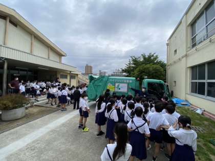 27日(金)、4年生の社会科の学習のため環境事業センターの方3名が来られました。2時間目、3時間目を使って、パッカー車についての機能を教えてもらったり、ごみについて学習したりしました。