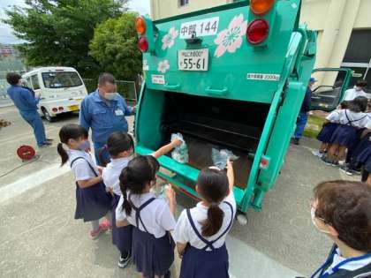 紙ごみを1人ずつ実際にパッカー車に入れる体験もさせてもらい、目の前で見るパッカー車の動きに子どもたちは驚いた様子でした。