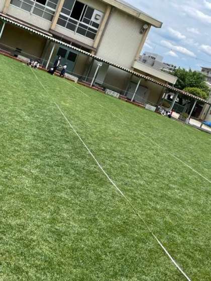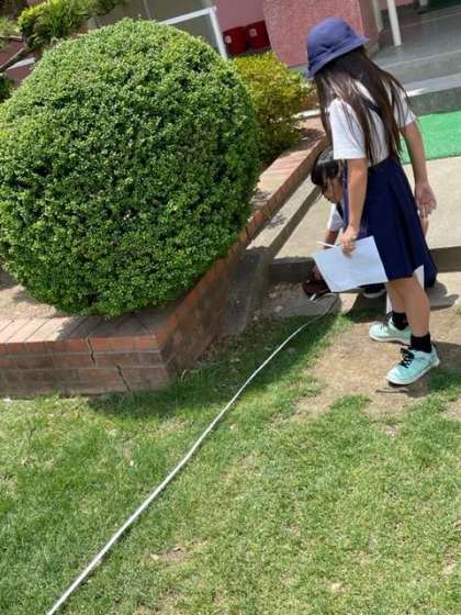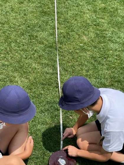 中運動場の端から端までや、木の周りを測ったりとそれぞれのグループで協力しあって学習に取り組んでいました。