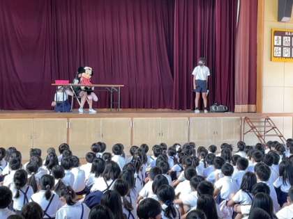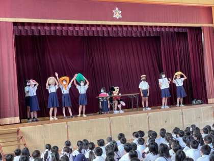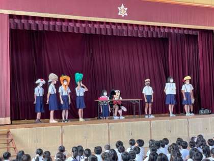 ぬいぐるみや着ぐるみを着た給食委員会の児童が登場し、好き嫌いなく食べることや、食べ物を粗末にしないことを熱演して伝えてくれました。