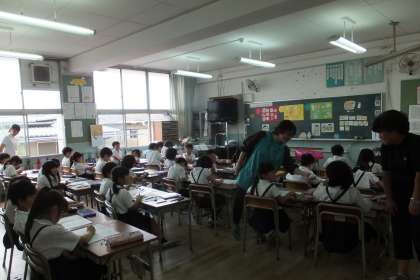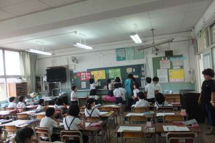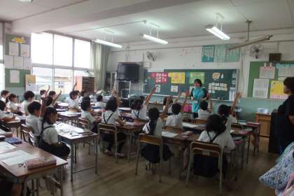 栄養教諭の先生の説明をよく聞き、たまねぎやニンニクを触ったり、匂いをかいだりしました。食べもののはたらきを「赤色」体をつくる「黄色」ね熱や力のもとになる「緑色」体の調子を整えるの3つに分け、お肉やごはん、野菜がどのはたらきをしているかを調べ、最後に手を挙げて発表していました。
