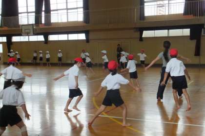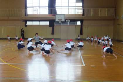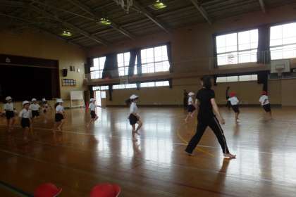 でも、1年生は元気に体育館でリズム体操をしていました!!スキップやアヒル歩き、とても、楽しそうでした!!