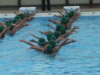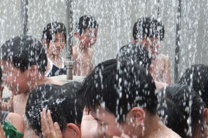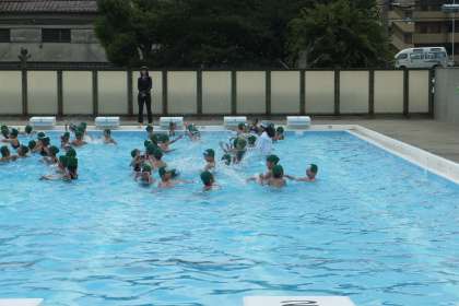 1年生の子どもたちは、小学校の大きなプールを目の前にして、テンションは高めです。最初にシャワーを浴びると、「アッ、冷たい!!」と思わず声が出ます。先生のハンドサインでプールに入るとテンションはマックス状態。でも、今度は声を出さず、先生の指示を聞いていました!!