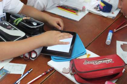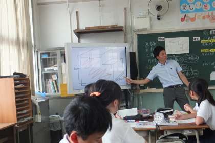 与えられた立体が角柱であることに気付かせるため、各班にタブレット端末を持たせたり、電子黒板を使用し、イメージを膨らませる工夫をしていました。