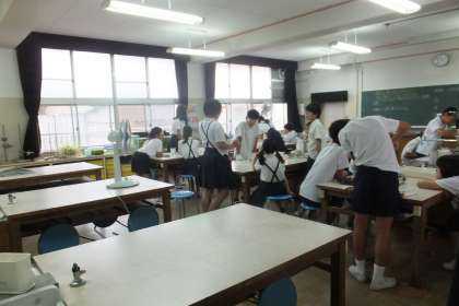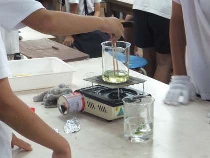 「日光と葉のでんぷん」の関係を調べる実験をしていました。学習園のホウセンカの葉の葉緑素を抜き、でんぷんのでき方を調べていました。