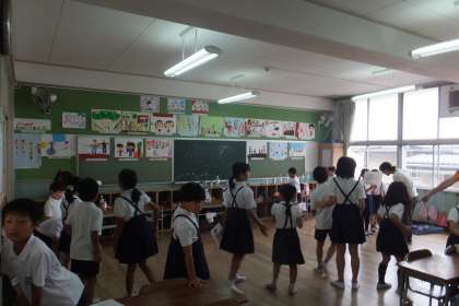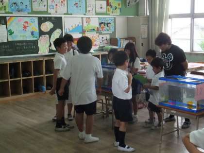 2年1組は「シューティングゲーム」、2組は「うまくはいるかな?」をしています。