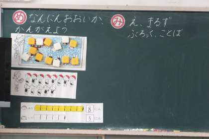 授業は、子どもたちに引き算の考え方(概念)をしっかり教えるため、問題解決型学習の形式で進められました。「8−5」の差を求めていくの学習を子どもたちに理解させるため、教員の工夫と努力があるんですよ!!