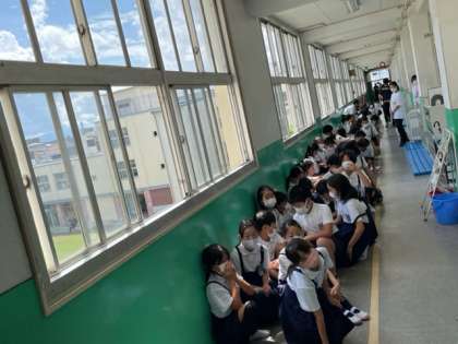 その後、津波を想定した訓練を引き継ぎ行いました。2階の教室を使う学年は、3階に素早く避難をすることができました。