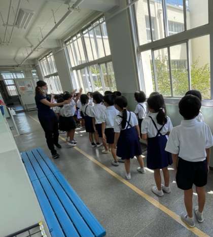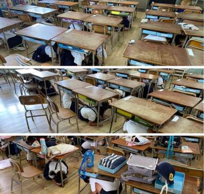 3時間目は避難訓練を行いました。地震を想定に、咄嗟に自分の身は自分で守ること、机の下に頭を入れることができました。