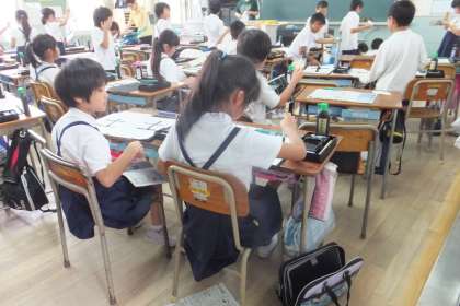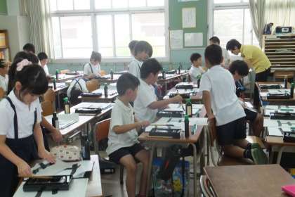 鉛筆とは違い、筆の入り方、止め方など筆の扱いに苦労していました。清書した作品から一つを選ぶのに、「先生、どっちがいいですか?」と尋ねていました。