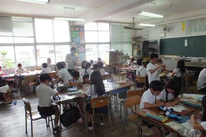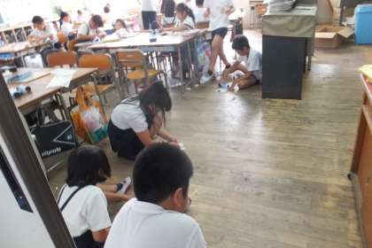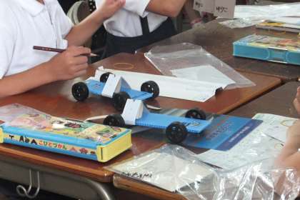 出来上がった児童から、教室の床で車を走らせました。ゴムを引っ張ってスタート台から発車させるのですが、ゴムがからまり上手くいきません。何度か試して、やっと走るようになりました。